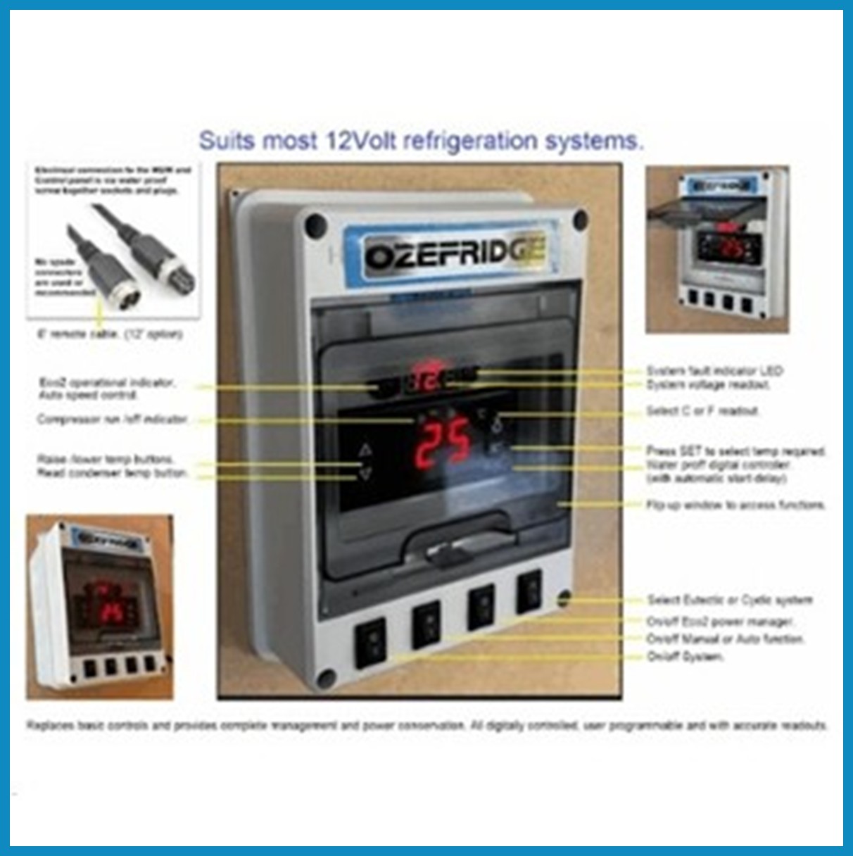 Retrofits to most 12v refrigeration systems. Replace your tired mechanical thermostat with our digital temperature controller and enjoy the latest features of the Ozefridge systems: